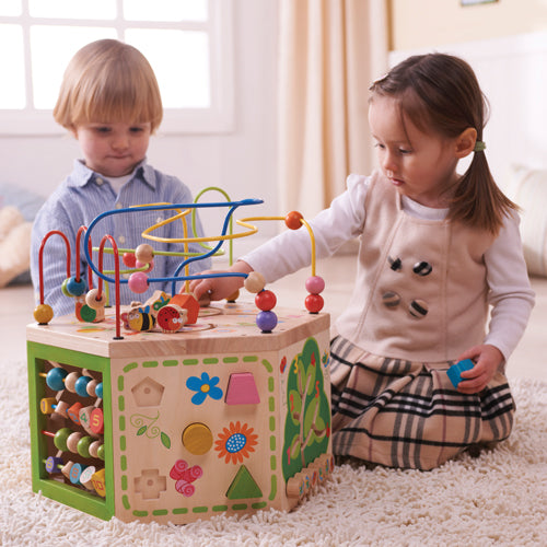 - 6 SIDES OF ACTIVITIES – This baby activity cube keeps child entertained with geometric shape sorting, counting beads, sliding animals, spinning gears and a wire bead maze on top!